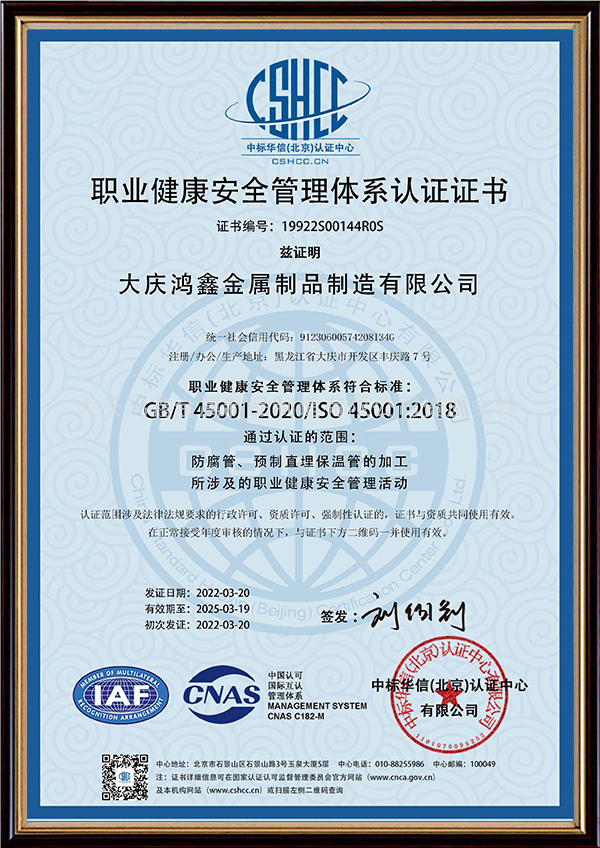 職業(yè)健康安全管理體系認證證書